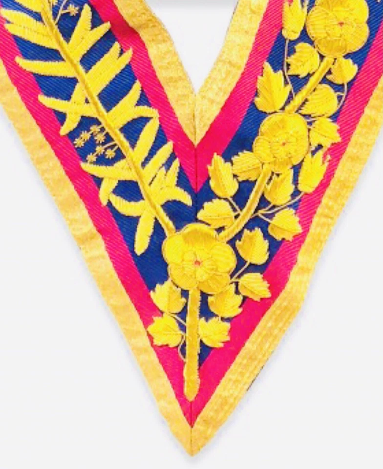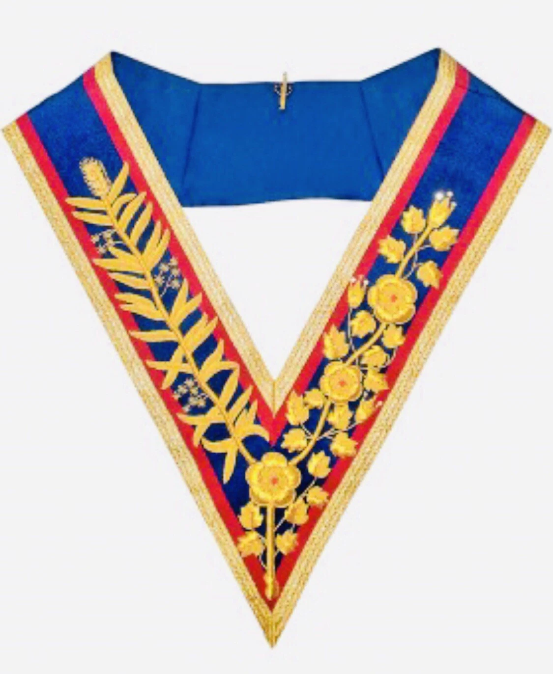 According to the dignity of rank, this triangular collar is blue in color with finest quality of hand embroidered bullion wire. In this, you will get the beautiful designs of flowers on one side and leaves on the other side. All the embroidery work is done with gold color with a hint of red in the middle.
