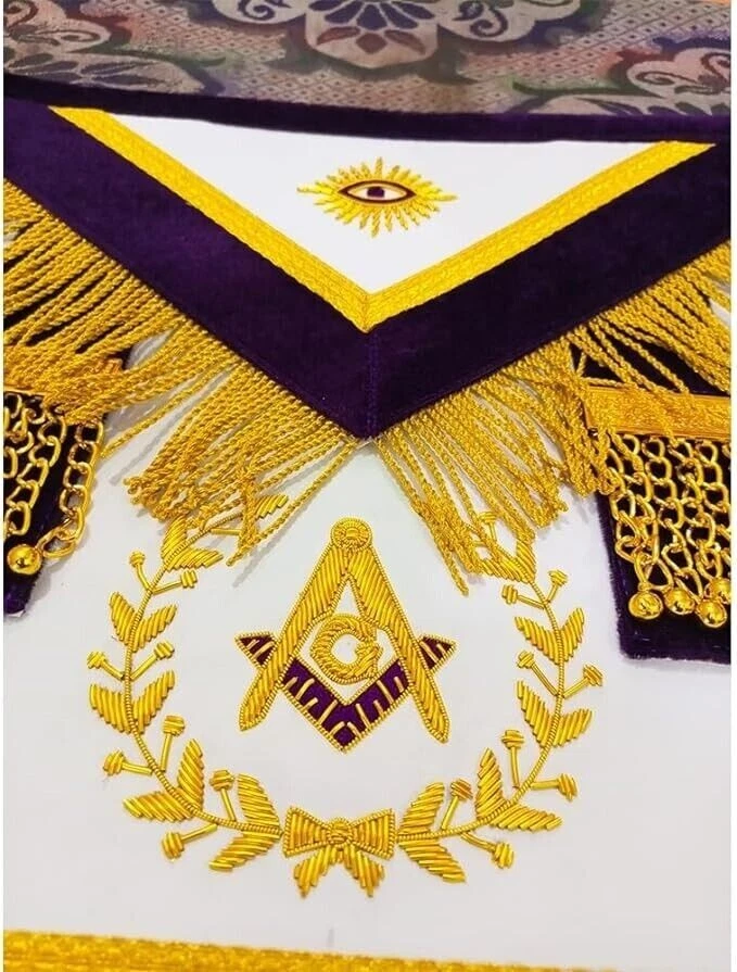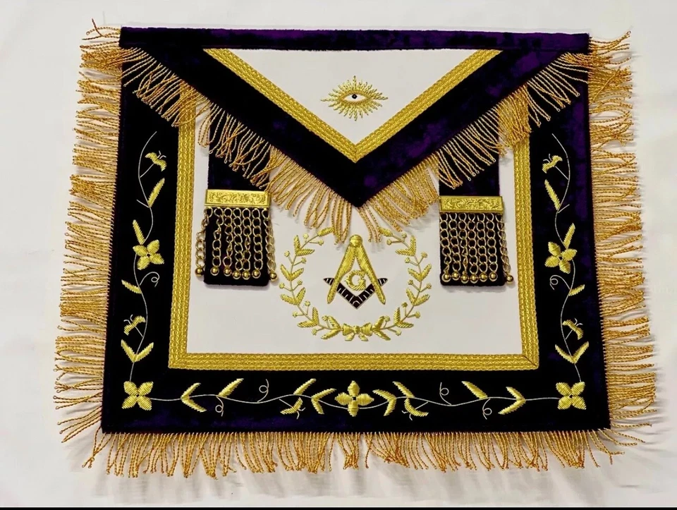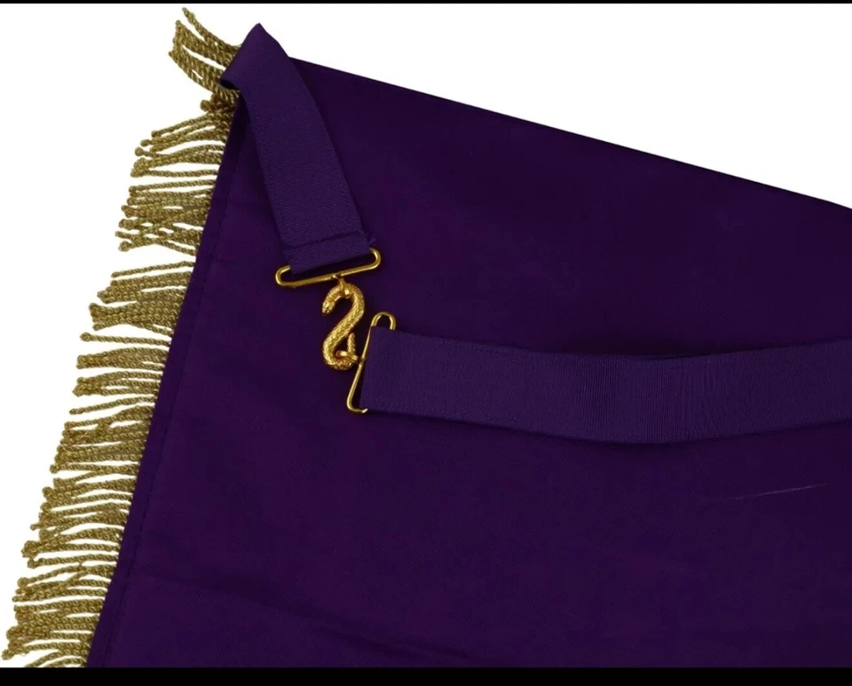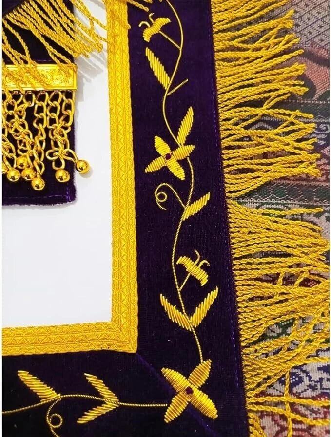 • Masonic dark purple hand made aprons “eye” symbol on Flap and “G” symbol on the obverse and 4cm wide golden metallic fringe all around apron and flaps