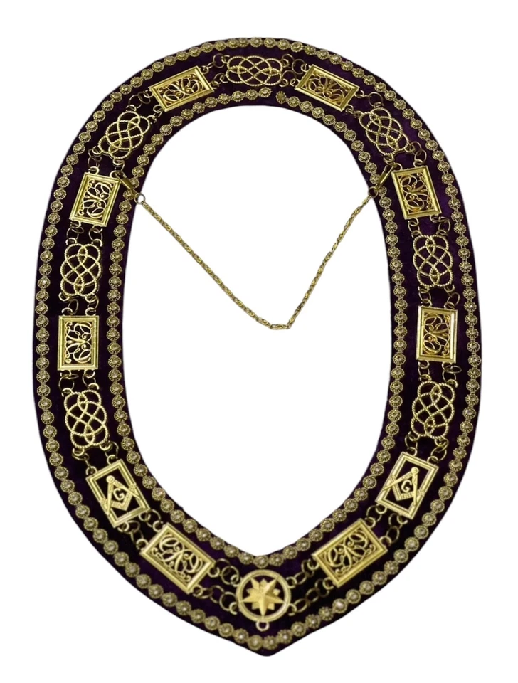• High quality gold plated metal chain collar edges trimmed with gold rhinestones master mason necklace with golden chain support